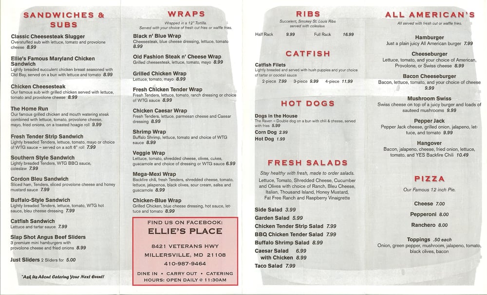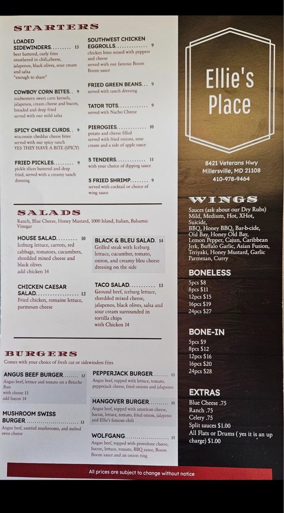 Introducing Ellie's Place, a vibrant New American eatery located at 8421 Veterans Hwy, Millersville, MD. This unclaimed gem offers a delightful menu that features everything from crispy wings to unique burgers, making it an ideal spot for groups and families alike. With options for takeout, delivery, and an enticing full bar, you're guaranteed a fantastic dining experience.